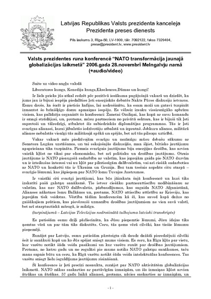 Valsts prezidentes runa konferencē “NATO transformācija jaunajā globalizācijas laikmetā” 2006.gada 28.novembrī Melngalvju namā (+audio/video)