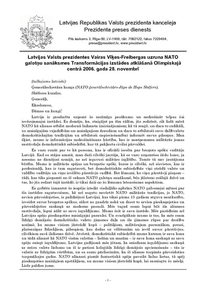 Latvijas Valsts prezidentes Vairas Vīķes-Freibergas uzruna NATO galotņu sanāksmes Transformācijas izstādes atklāšanā Olimpiskajā centrā 2006. gada 28. novembrī
