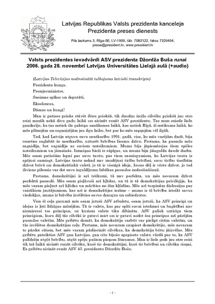 Valsts prezidentes ievadvārdi ASV prezidenta Džordža Buša runai 2006. gada 28. novembrī Latvijas Universitātes Lielajā aulā (+audio)