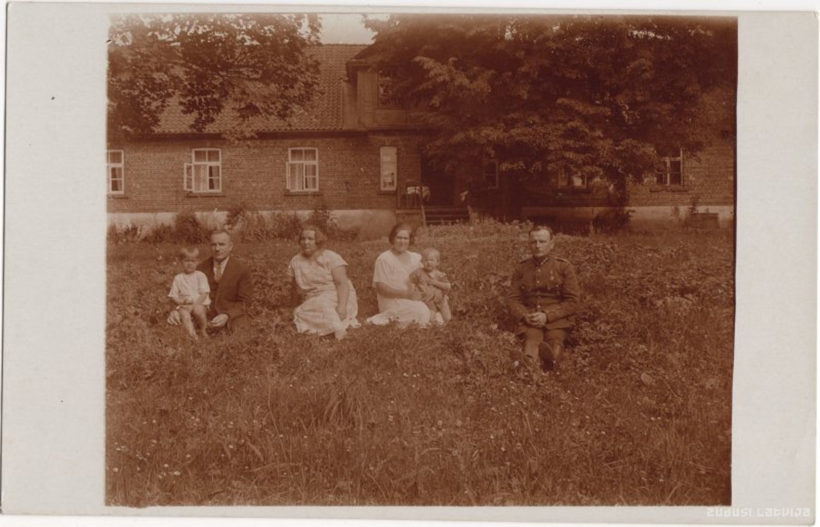 Vīrieši, sievietes, bērni zālienā Durbes Raibās muižas priekšā