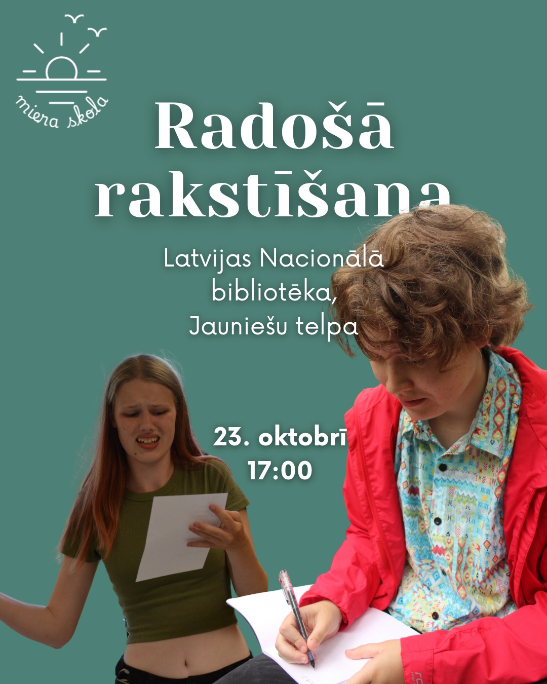 23. oktobrī no plkst. 17.00 līdz 18.30 Latvijas Nacionālās bibliotēkas Jauniešu telpā (M stāvā) sadarbībā ar “Miera skolu” notiks Radošās rakstīšanas darbnīca, norises laikā dalībnieki būs iespēja attīstīt savu kreativitāti un iepazīt citus radošus cilvēkus, rakstot par kopīgu tēmu, jebkādā formātā izpaužot sevi un savas emocijas. Pieteikšanās: