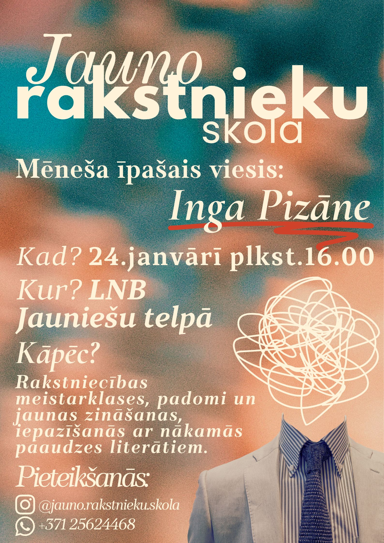 24. janvārī no plkst. 16.00 līdz 18.00 Latvijas Nacionālās bibliotēkas Jauniešu telpā (M stāvā) notiks Jauno rakstnieku skolas otrā meistarklase jauniešiem vecumā no 12 līdz 18 gadiem. Mēneša īpašais viesis būs dzejniece Inga Pizāne. Rakstniecības meistarklases laikā dalībniekiem būs iespēja saņemt padomus, jaunas zināšanas, iepazīties ar jaunākās paaudzes literātiem. Dalībai meistarklasē iepriekšēja pieredze rakstniecībā nav nepieciešama.