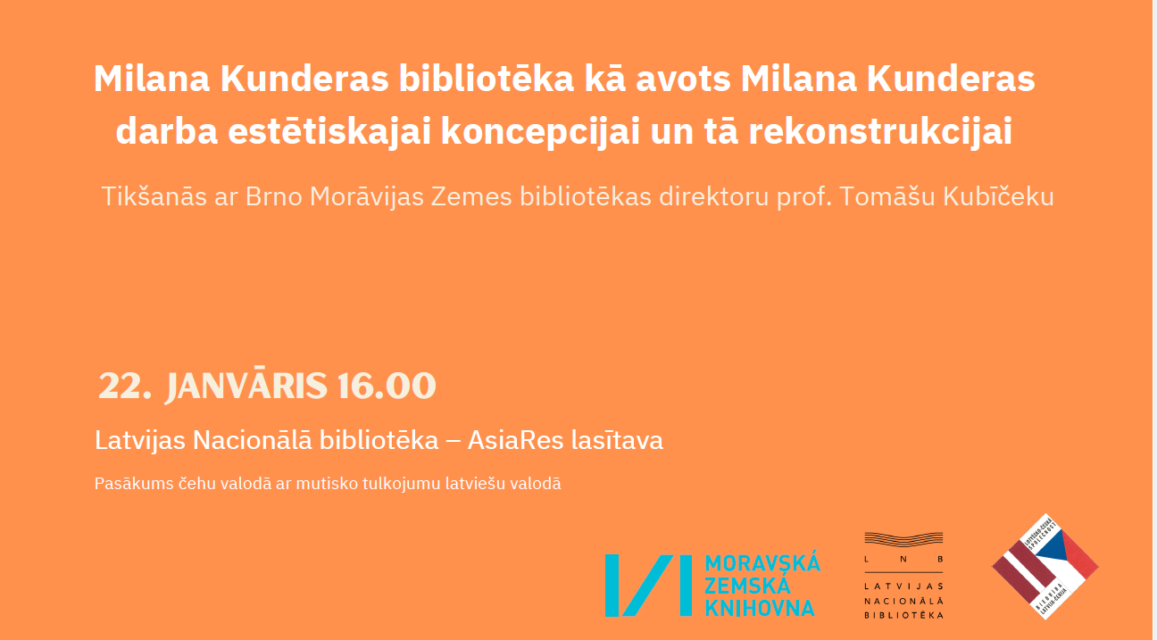 22. janvārī plkst. 16.00 Latvijas Nacionālās bibliotēkas AsiaRes lasītavā 3. stāvā notiks čehu profesora, PhD, literatūrzinātnieka Tomāša Kubīčeka lekcija. Katra personīgā bibliotēka ir radošas domas liecība, kas pielāgo tās saturu. Tāpēc nav pārsteiguma, ka arī čehu rakstnieka Milana Kunderas (Milan Kundera