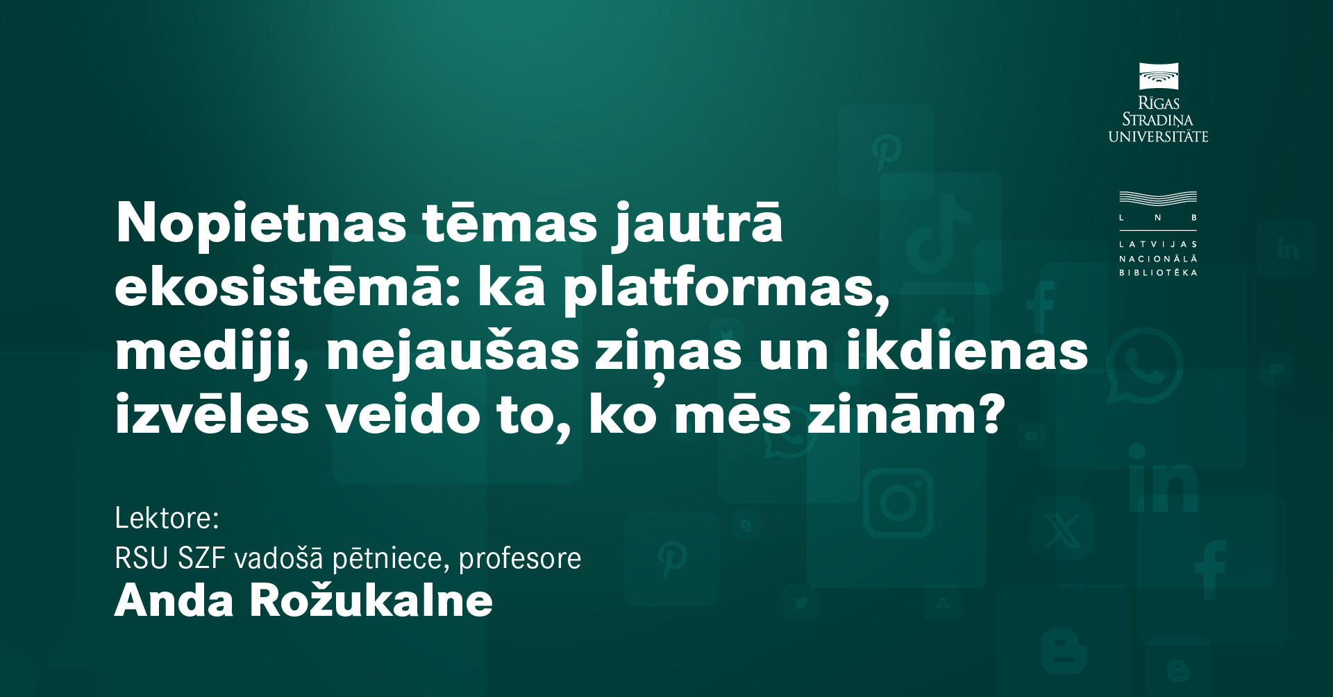 notiks Rīgas Stradiņa universitātes Sociālo zinātņu fakultātes vadošās pētnieces, profesores Andas Rožukalnes vieslekcija. Kā platformas veido to, ko mēs zinām, un to, ko tikai domājam, ka zinām? Lekcijā runāsim par mediju lietošanu: no mīlestības līdz naidam un algoritmu radīto kontroles ilūziju. Lielu daļu no mūsu ikdienas dzīves veido pastāvīga atrašanās digitālajās platformās, mediju, satura veidotāju un neskaitāmu informācijas sniedzēju piesātinātā vidē. Nepārtrauktas mediju lietošanas sajūsmā un rutīnā bieži vien neapzināmies to, kas paliek nepamanīts. Informācijas plūsmas ātrums un pieejamība ietekmē, kā mēs jūtamies, domājam un pieņemam lēmumus.
